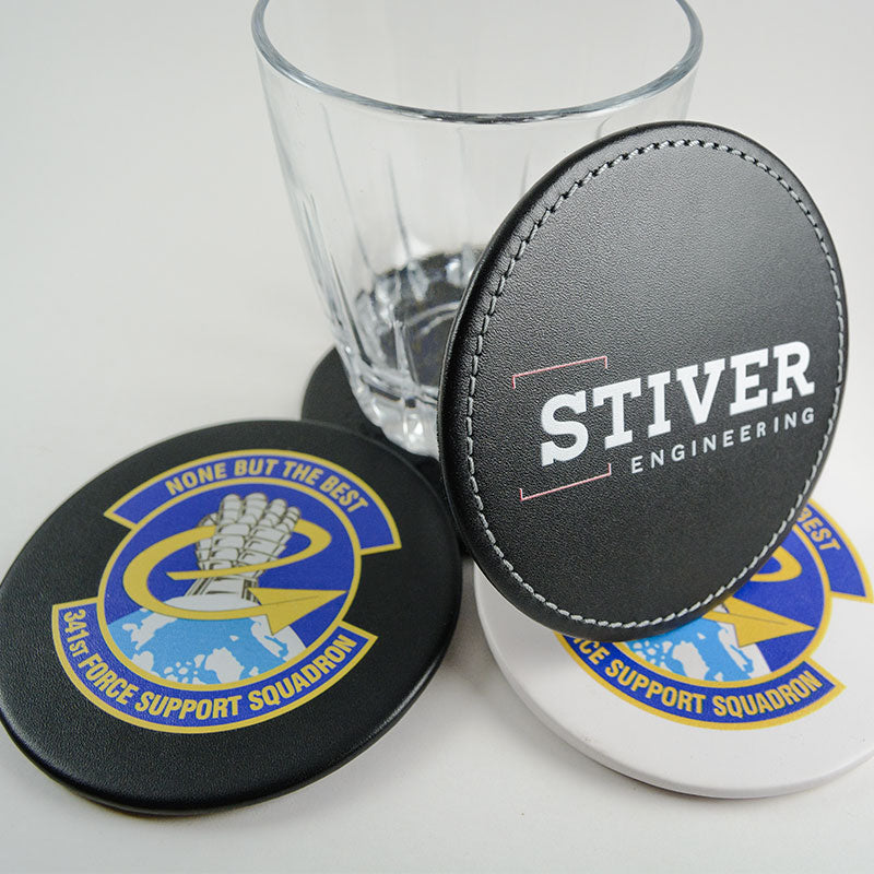 Run Charge Per Piece: Qty. of 1-49 $5 (G); Qty. of 50-99 $4 (G); Qty. 100-249 $3 (G); Qty. 250+ $2 (G). Luggage tags, coffee sleeves, holiday ornaments, and individual coasters are $1.25 (G).