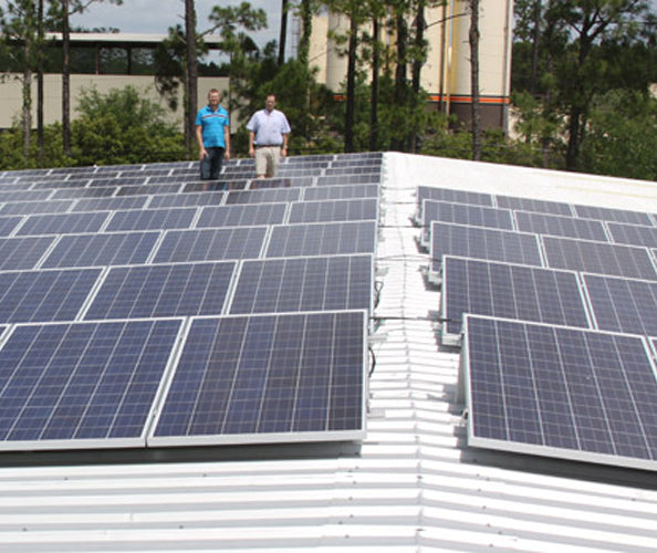 The system uses grid-tied solar panels capable of generating 32.2 KW of power in clear conditions. It was designed to generate each month the amount of power the company consumes, so as to remain energy neutral.