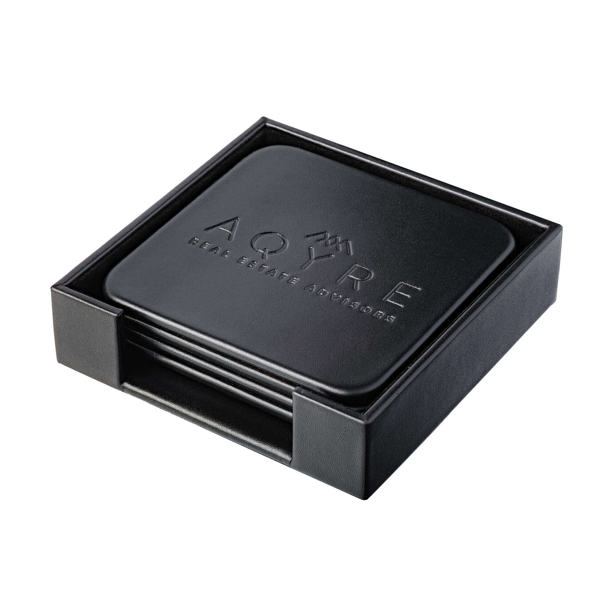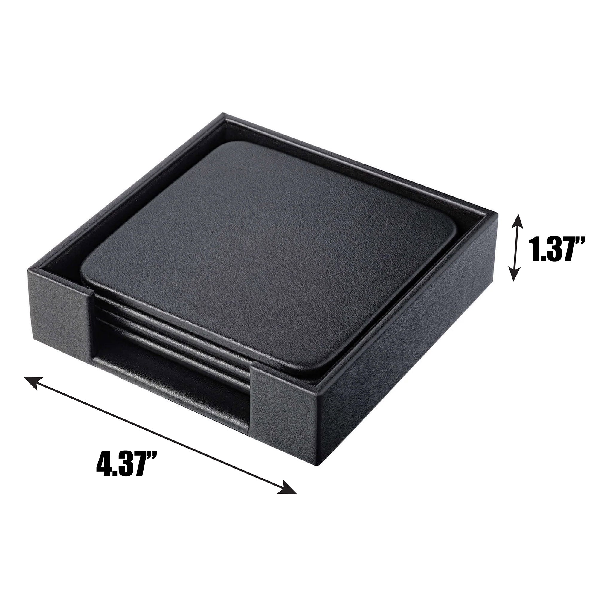 Black Leatherette 4 Square Coaster Set w/ Holder
